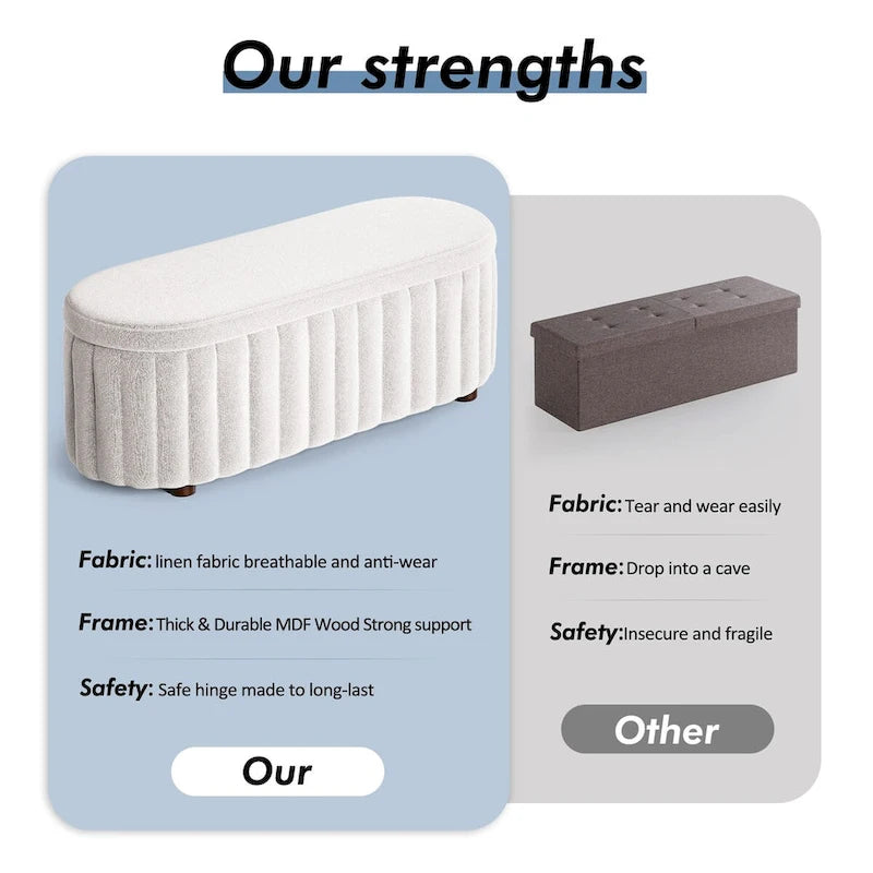 Easy maintain & Breathable - Our elegant storage ottomans are made from eco-friendly linen fabrics, which are very breathable and Make sure no unpleasant odour on first use. Tight and anti- wear, it prevents fabric breakage. The seat board is made of high quality MDF boards that won't collapse with long term use. first use. The seat board is made of high quality MDF boards that won't collapse with long term use.