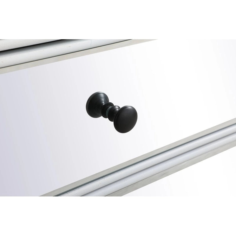 Add a touch of glamour to your living space with the Chamberlan 5 Drawer Cabinet. This modern and sleek dresser is made of high-quality MDF and wood, featuring solid wood legs that provide sturdy support. The five drawers offer ample storage space for your clothes, accessories, and other items. The large drawer dimensions are 26.3 inches long x 12 inches wide x 8.5 inches high while the small drawer dimensions are 26.3 inches long x 12 inches wide x 6.8 inches high. With a soft grey finish and silver color, this dresser will complement any home decor style, making it a versatile addition to any room. Silver finish and clear mirror Solid wood material Silver hardware