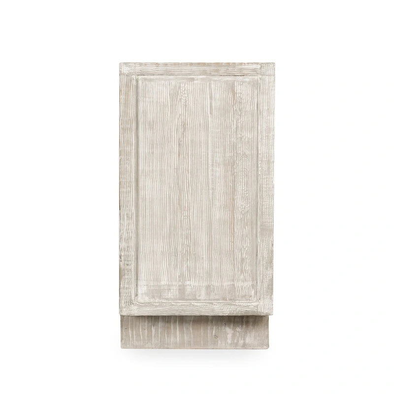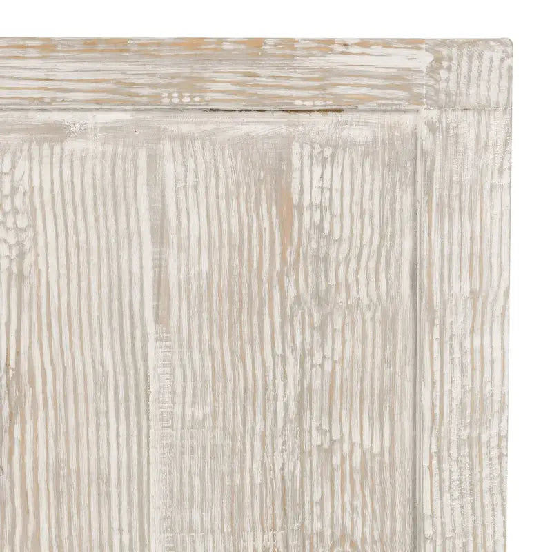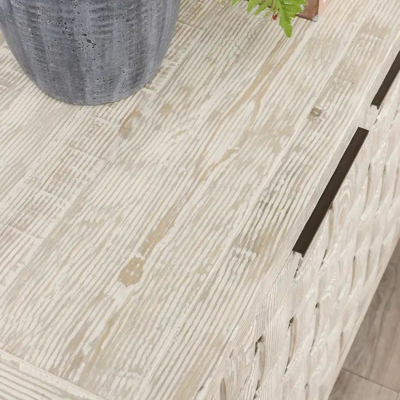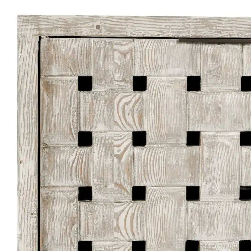 Carved with a dimensional, basket weave pattern, this cabinet features reclaimed pine wood transformed into a sophisticated yet functional piece. Offering elements from traditional style in a reimagined way, this sideboard suits a variety of styles while adding versatile storage and display space to a living or dining space.