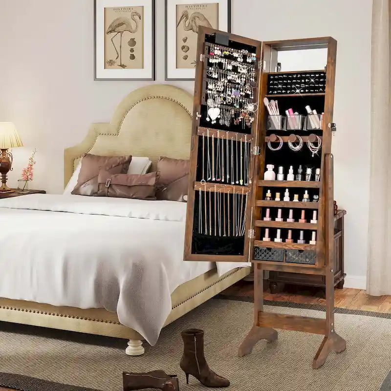 Illuminate your daily dressing routine with our jewelry cabinet featuring enchanting lights. This elegantly designed cabinet comes equipped with a full-length HD mirror that not only lets you view your entire outfit but also bathes your room in a soft, romantic glow with 20 bright LED lights. Stay organized effortlessly with diverse storage options to provide ample space for both jewelry and cosmetics. Adapt the jewelry armoire to your needs with 4 adjustable tilt angles. The cabinet features a built-in makeup mirror allowing for easy makeup applications. Security is refined with a magnetic catch and lockable door. Crafted for durability and thoughtful design, the armoire stands on a triangular base for maximum stability and is lined with soft velvet to prevent scratches on your jewelry. An ideal blend of aesthetics and functionality, this piece offers abundant storage solutions for all your cherished items.