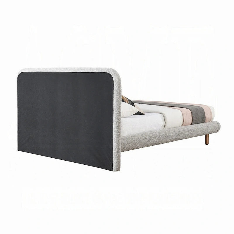 Damazy King Size Bed, Curved Edges, Gray Boucle Upholstery, Brown Wood