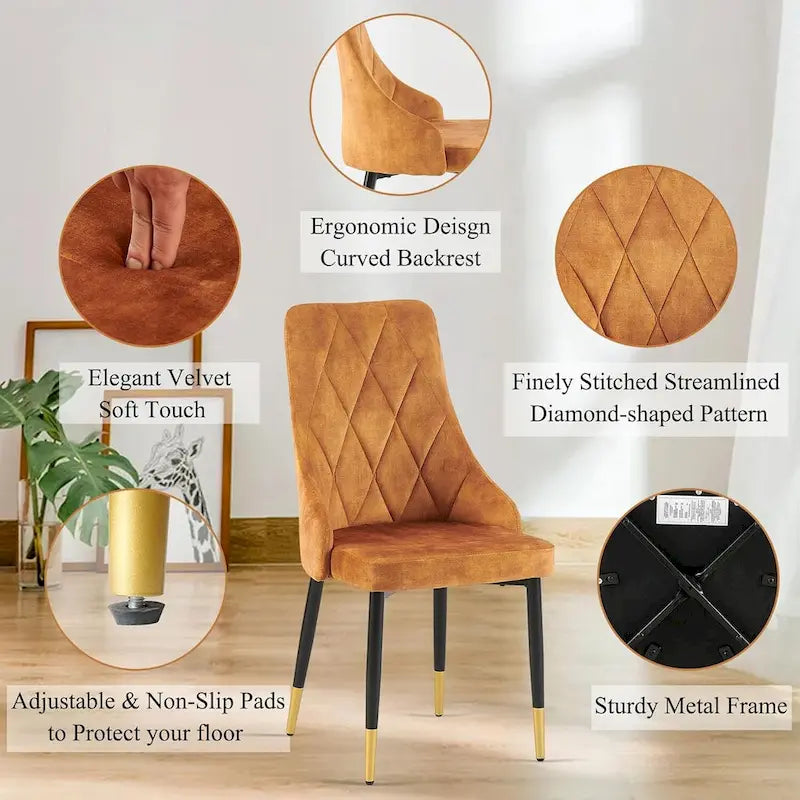 - Upholstered Velvet Chairs: Enhance your dining area with this chic and comfortable dining table set! Featuring a beautiful oblong table and four elegant velvet chairs. Both backrest and seated are filled with high-density sponge with soft velvet surface.The backrest is designed according to the curvature of ergonomics, which is comfortable and adds a touch of sophistication to the chair.