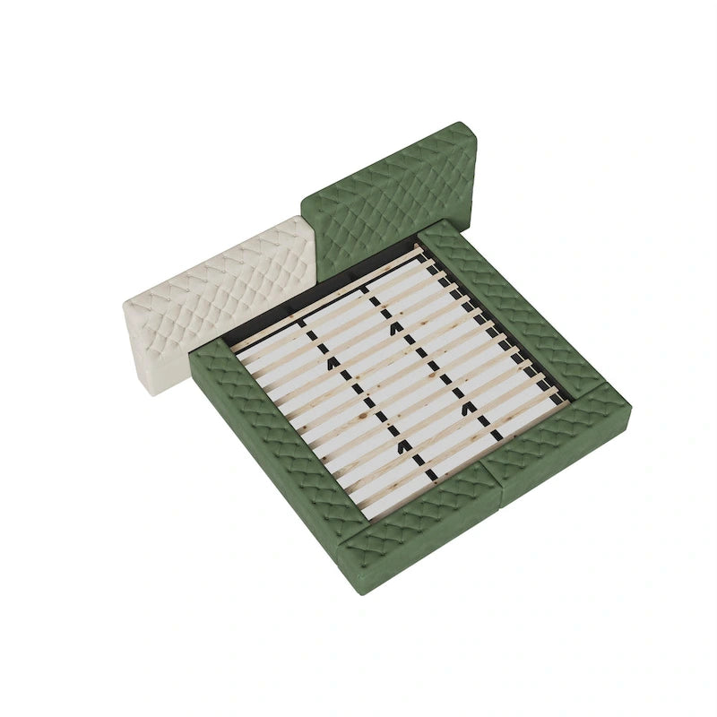 - Remarkable Beauty and Graceful Lines: Marvel at the remarkable beauty and graceful lines of the Special-shaped Upholstered Bed collection. This bed has a rich look, with deeply tufted upholstery along its upper platform perimeter and headboard, ensuring that it is a good fit in modern bedroom themes. The footboard and side rails all contain ample storage and seating. And the bed comes with full slats, so you can use it without a box spring. The polyester fabric used in its design makes it easy to integrate alongside other furnishings.