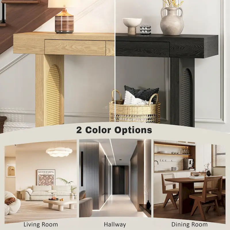 Product FeaturesPremium Craftsmanship and Materials: Expertly crafted from high-quality natural wood veneer, this console table offers exceptional durability and timeless appeal. The warm wood grain finish adds a touch of refinement, while the sturdy construction ensures long-lasting stability, combining functionality and style in one elegant package.Convenient Storage Solution: Organize your space effortlessly with two spacious drawers, perfect for storing daily essentials like keys, notebooks, or electronics. The smooth-gliding drawer tracks provide easy access, while the minimalist design keeps clutter hidden, maintaining a sleek and tidy appearance.Versatile and Multi-Functional: Designed to fit a variety of settings, this entryway table works seamlessly as an entryway organizer, a living room accent, or a decoration table. Its compact size and practical features make it an ideal addition to homes of all sizes, offering both functionality and style.Partial assembly required. This console table with storage comes with detailed instructions, and it can be installed step by step following the instructions, which can help you complete the assembly as soon as possible.Description[Details]Material:MDF+ solid wood veneerWeight Capacity:Top: 220 LBS Drawer: 55 LBSDrawer Interior Dimensions:14.8W x 10.8D x 2.7HFinish:PaintingFinish Back:YesPackage Number:1Assembly Required:20 minAdditional Tools Required:All Tools IncludedMaintenance & NoticeAbout Finish:Liquids should be immediately blotted with a damp cloth. Do not use surface cleaners that could remove the finish.About Hardware:Hardware may loosen over time; periodically check to make sure all connections are tight.About Fasteners:Don't over-tighten fasteners, as this may cause distortion or breakage.About Veneer:Grain appearance variation can be expected from lot to lot, it will vary from what is pictured because it is natural wood veneer.Keep it looking its best1.Fabric furniture Care;Dust regularly. Clean gently with a clean, slightly damp cloth. Professional cleaning is recommended.2.Wood Furniture Care:We recommend dusting frequently with a clean, soft, dry, lint-free cloth. Clean the surface by rubbing in the direction of the grain and wipe dry.3.Avoid direct sunlight.4.Avoid the use of all chemicals, household cleaners, abrasives, or cleaners that contain lemon, vinegar, or other acids that may damage the finish.5.Do not place hot appliances, such as curling irons and hot hair dryers directly on the countertop.6.Spot clean using distilled water and water-based cleaning agents, foam or mild water-free cleaning solvents. 7.Always test a small inconspicuous area first.8.Hardware may loosen over time; periodically check to make sure all connections are tightNotes1.Size Notice:Manual measurement has been used, there may be some reasonable errort, thanks for your understanding.2.Color Notice:Due to factors such as display equipment and shooting environment, the color of the item may be slightly different from the picture, which is a normal phenomenon, please refer to the actual item3.Assembly Notice:Please read assemble manual in advance. Please do not over-tighten nuts, as this may cause distortion or breakage.4.It is recommended to put a layer of foam or soft cushion on the floor when installing to avoid scratching the floor.5.If the item has any defects, damage or missing parts, please contact us with pictures or videos so that we can understand your needs and help you quickly, and always remember to retain its original packaging to ensure any return requests. We will try our best to solve any problems you may have.6.If you receive the wrong product, please attach the product picture, the infographic of the outer package and the picture containing SKUs, so that we can verify and quickly deal with it for you