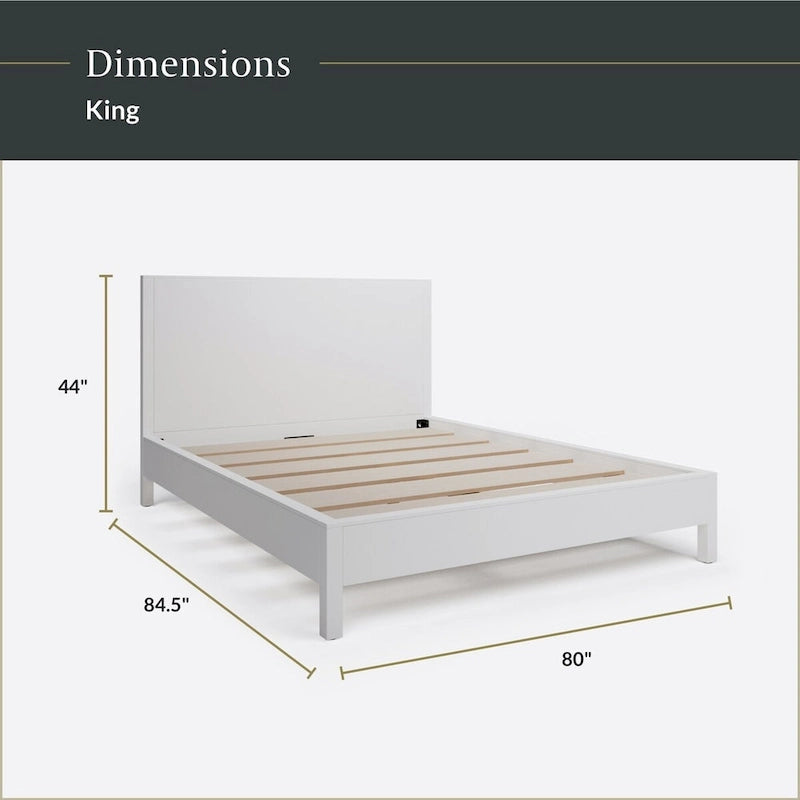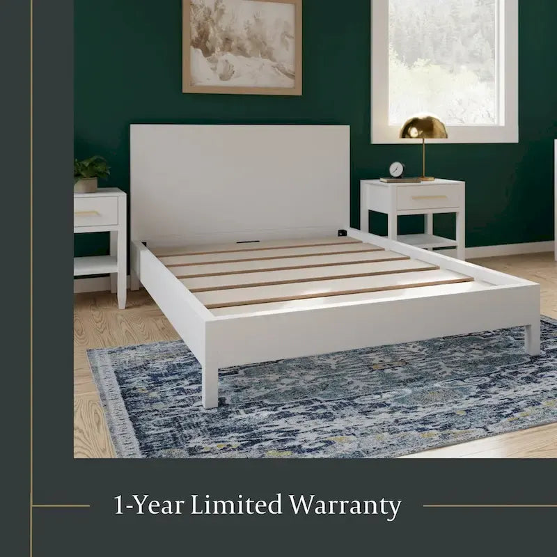 Create the stylish bedroom of your dreams with this solid wood platform bed frame. This modern bed frame has sleek lines, subtle details, and square legs that add an understated elegance to any room. Made of solid Acacia, this wood bed frame has supportive slats and a center support bar to ensure it will last. The bed is also compatible with various mattress types, accommodates standard mattress sizes, and does not require a box spring to give you the versatility you need. It is available in Chestnut or White to best fit your room's aesthetic. This bed is part of a matching set that includes a nightstand, a 5-drawer dresser, and a 6-drawer dresser to create a cohesive furniture design. Conveniently shipped in two boxes, this stylish bed requires basic assembly so you can use it right away.MODERN STYLE: This wood bed frame has a sleek, modern design with clean lines and sturdy square legs VERSATILE DESIGN: Available in Queen and King sizes, this platform bed accommodates most standard mattress sizes, does not require a box spring, and is compatible with zero clearance adjustable bases COLOR OPTIONS: This bed is available in two colorways, a White bed frame or a Chestnut bed frame DURABLY MADE: Constructed of solid acacia wood, this bed frame with headboard has supportive slats and a center support bar to ensure it will last for many years to come BUILT TO LAST: The Queen bed frame measures 64(L) x 84.5(D) x 44(H), the King bed frame measures 80(L) x 84.5(D) x 44(H), and they both have a weight capacity of 600 pounds BASIC ASSEMBLY: Arrives in two boxes with all the hardware included for basic partner assembly. Just follow the instructions and this bed is ready for you to enjoy COMPLETE THE LOOK: Pair this dresser with the matching nightstand, 5-drawer dresser, and 6-drawer dresser to create a cohesive, modern look QUALITY GUARANTEE: To ensure the best quality, this wooden bed frame is backed by a one-year limited warranty