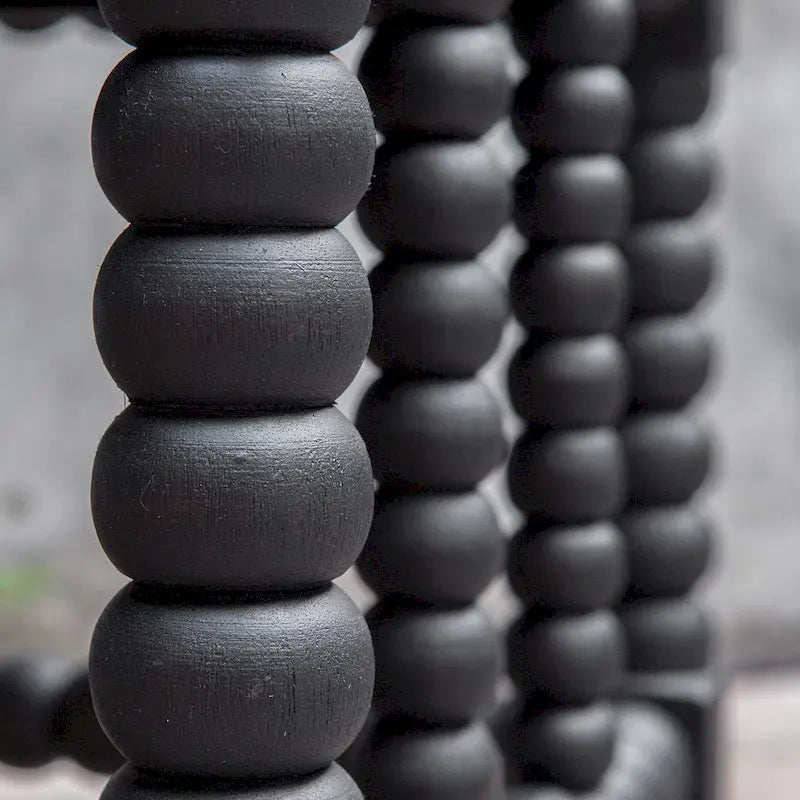 Ranch and modern lodge styles converge to create this plush, upholstered bench. The cushioned seat is wrapped in a charcoal grey and white faux cow hide, accented by a matte black stained base turned from solid plantation grown mahogany wood.